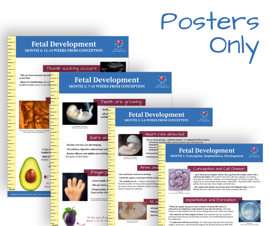 – Set of 9 posters, one for each month of pregnancy to put up in classroom or Pregnancy Help Organization and use for education.